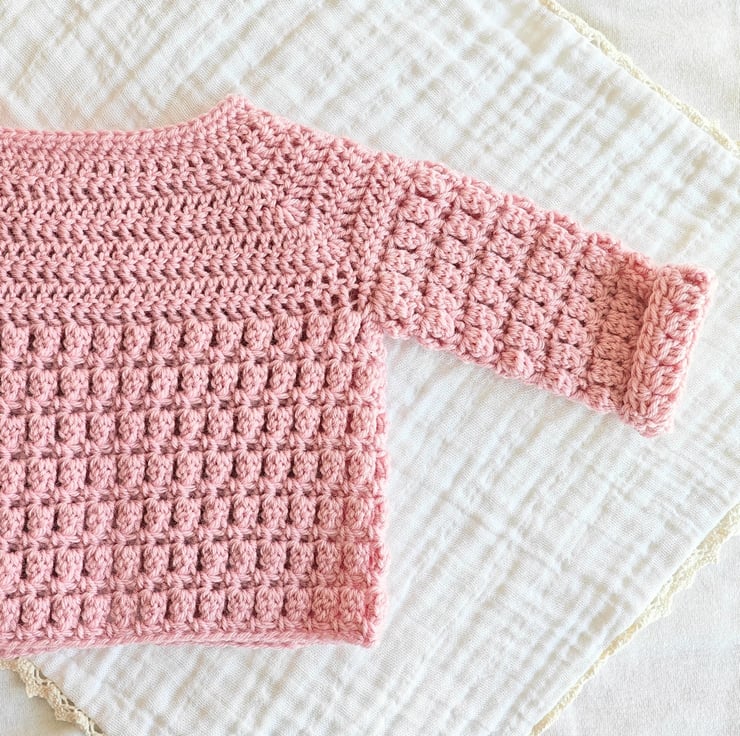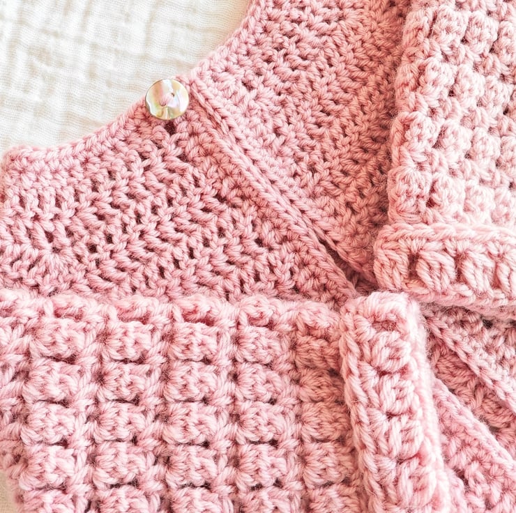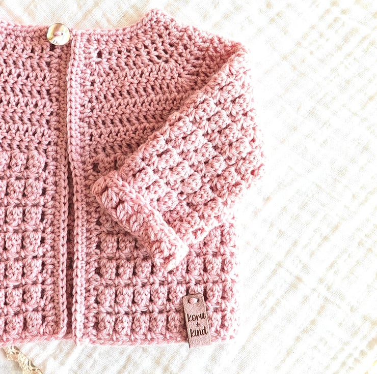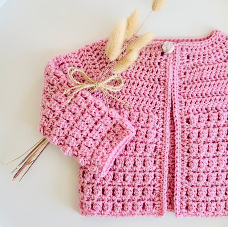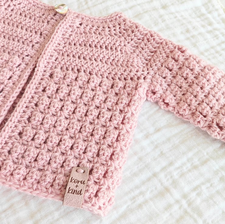 The Bobtail Cardigan is a lovely timeless item for a newborn baby. The cluster stitches create a puffy texture making it an ideal gender neutral cardigan. It's completed with a single pearly white shell button.