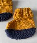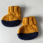 Pair of mustard and charcoal hand knitted bootees for approx age 0 - 6 months. Pull on bootees with turnover on leg.