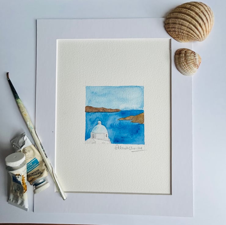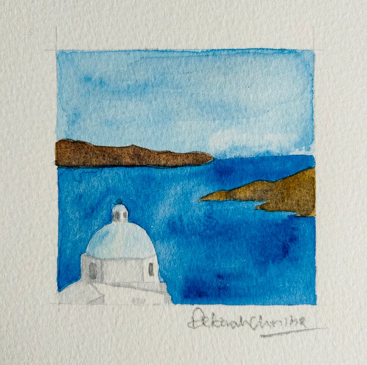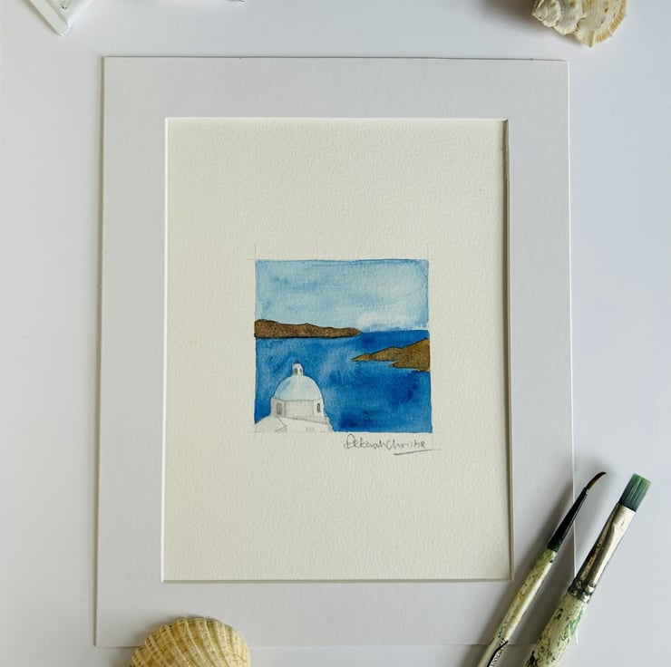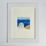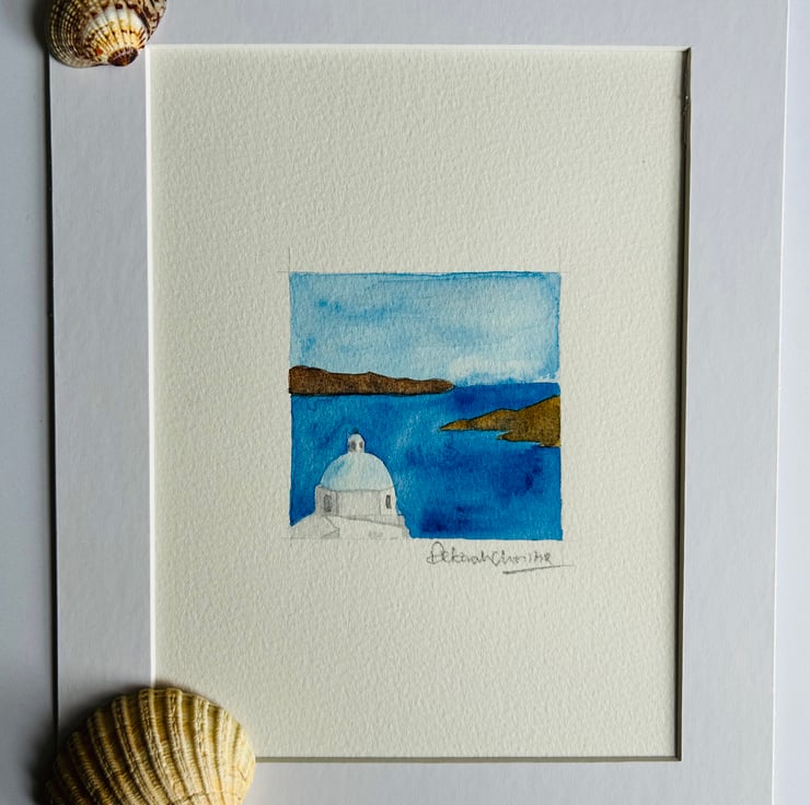 Small original watercolour of a Greek church domed roof against a background of sea and land. This is a church on the beautiful island of Santorini.