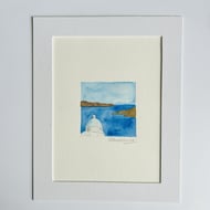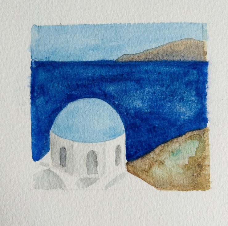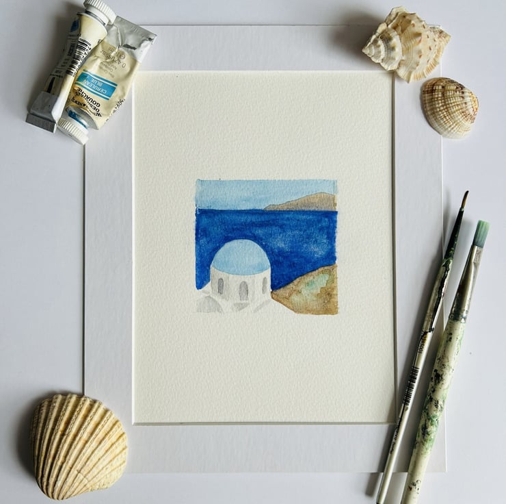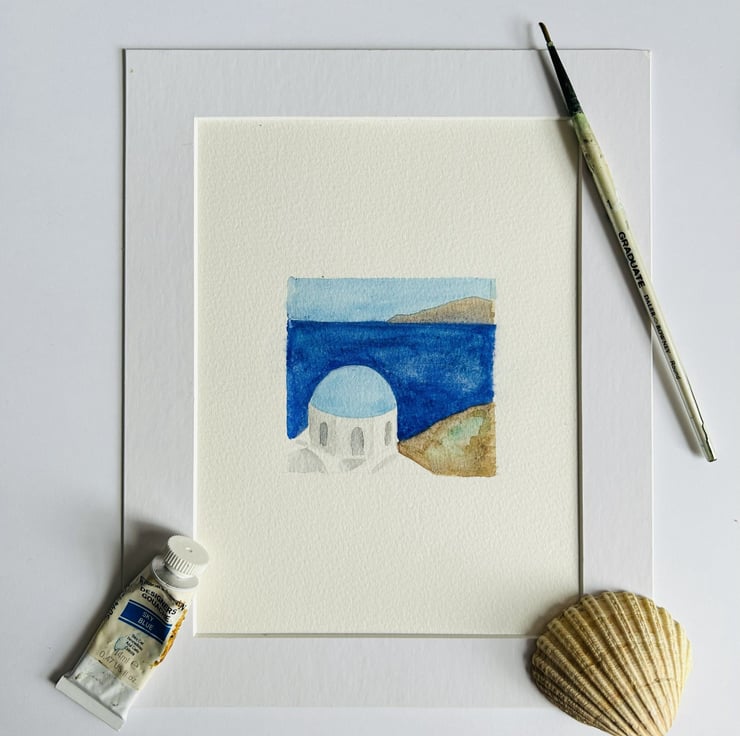 Small original watercolour of a Greek church domed roof against a background of sea and land. This is a church on the beautiful island of Santorini.