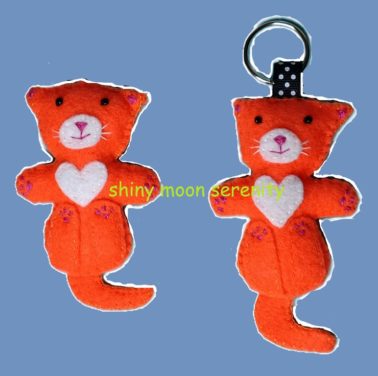 The main colours of the cat are orange and white. The eyes are made from black seed beads. Mouth, nose & paws are stitched in pink thread. The whiskers are stitched in white thread.