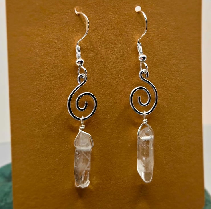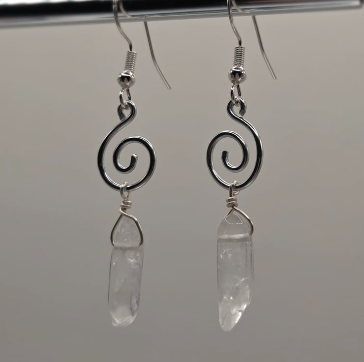 Handmade silver wire-wrapped mini spiral dangle earrings, with mini polished clear quartz crystal points and sterling silver hooks.